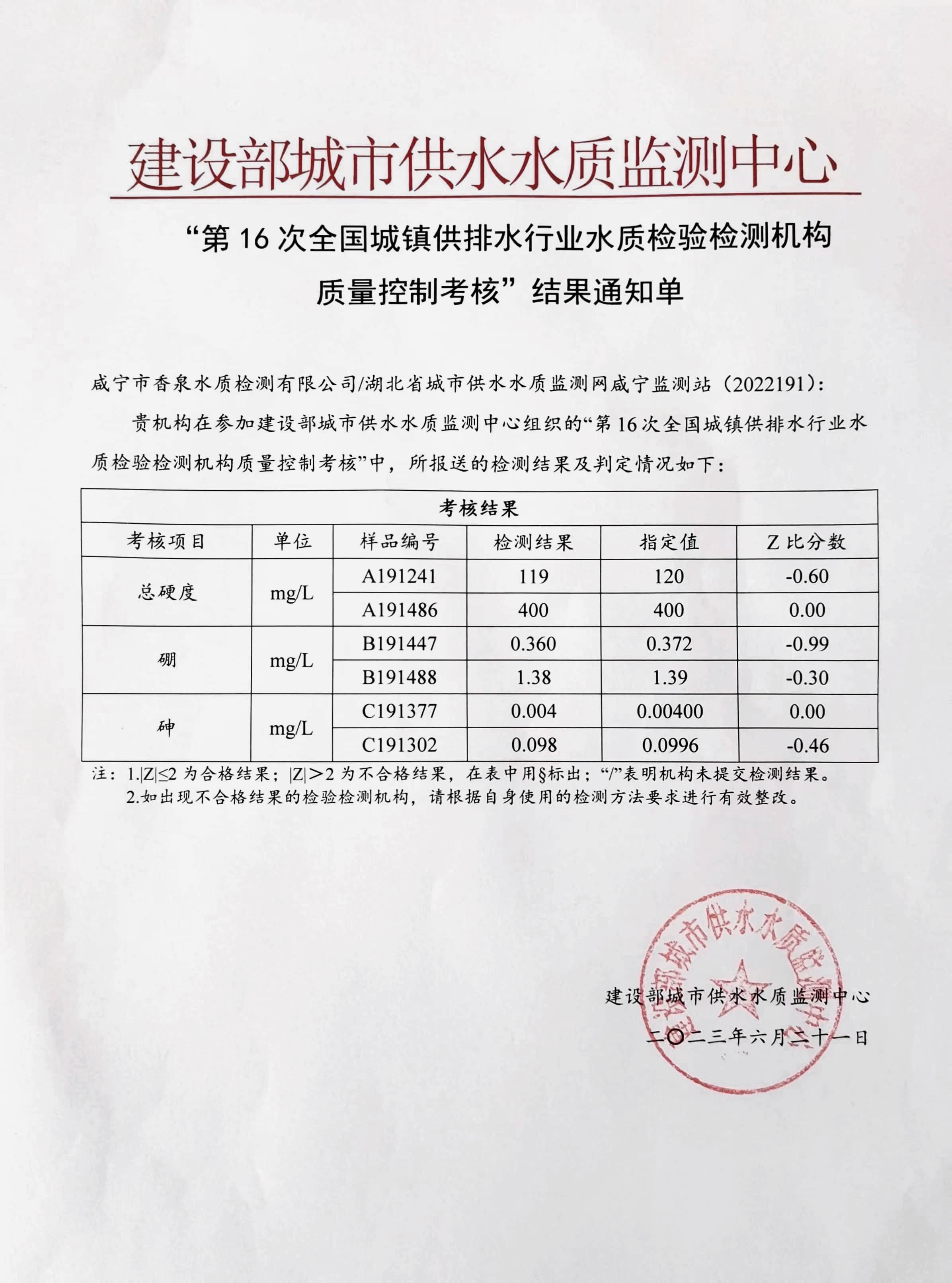 近日,聯合水務咸寧市香泉水質檢測有限公司暨湖北省城市供水水質監測網咸寧監測站傳來佳績,其參與的國家住建部城市供水水質監測中心于2022年11月組織開展的《第16次全國城鎮供排水行業檢驗檢測機構質量控制考核》活動,全部取得“合格”結果。