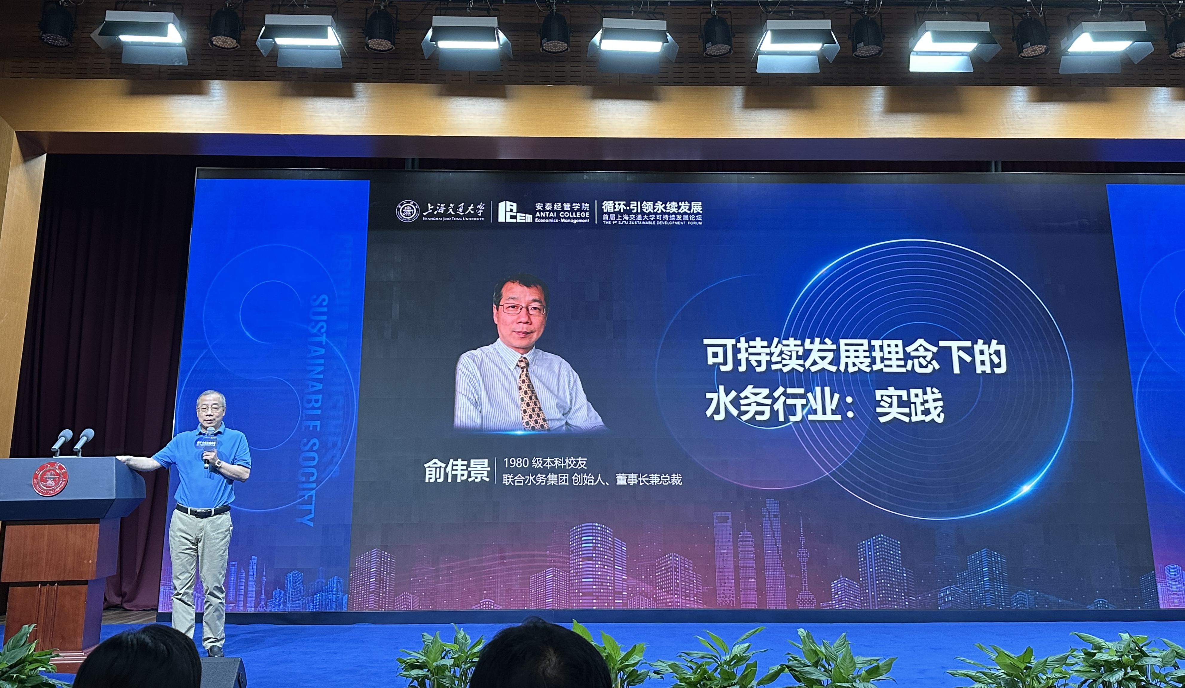 作為企業界的校友代表,俞偉景作了題為《可持續發展理念下的水務行業:實踐》的主旨演講。俞偉景從我國水資源基本特征及水務行業中的供水、排水、再生水利用等方面介紹了水務行業的發展與現狀,并分享了水務行業圍繞可持續發展理念在新能源應用、資源化利用、綜合治理一體化、智慧水務等方面的探索。他提及,聯合水務作為一家綜合性、全方位的水務公司,積極踐行可持續發展理念,在污水資源化利用、智慧水務等方面已有豐富的實踐經驗,并已開始在自有水廠探索與新能源的結合,實現節能降碳的目標。如今,公司邁入第二十個年頭,未來也將繼續開拓創新,創造新機遇,增添新動力。