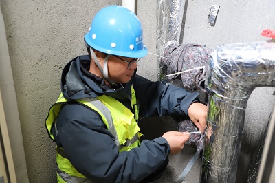 他是維修員張棟棟。背著沉重的工具包,他穿梭在大街小巷,寒風凜冽,腳步不歇,在狹小的管道井、在沒有電梯的樓梯間……他細致地檢查管道,包裹保溫材料,用腳步丈量責任,以實干詮釋擔當。“每一層的水表箱,我們都要對保溫棉、表套等進行檢查,并做好記錄。遇到雨雪冰凍天氣,我們還會增派人員,加大巡檢力度。”寒潮來臨前,公司全體維修員不畏嚴寒,爭分奪秒,對小區(qū)管道井、水表箱進行全面檢查和維護,每一處細節(jié)都不放過,一旦出現(xiàn)供水故障,他們會迅速組織人員搶修,以最快速度恢復供水。 “您好,聯(lián)合水務宿遷供水公司,您請講。”