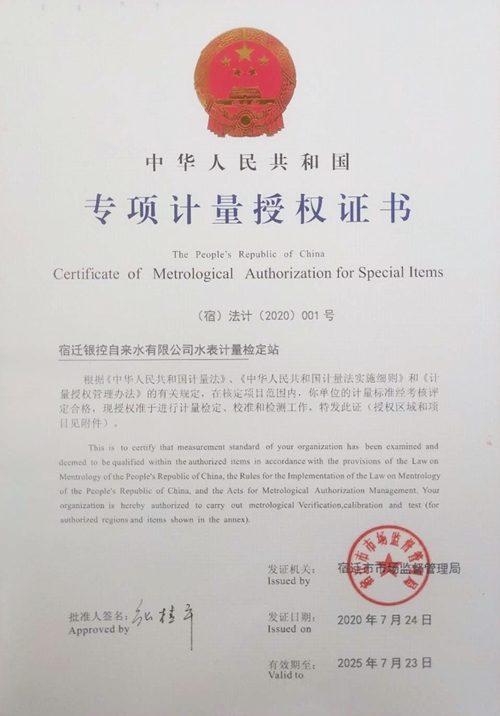 經過現場嚴格考核,根據《中華人民共和國計量法》、《中華人民共和國計量法實施細則》、《計量授權管理辦法》的有關規定,考核組認為:宿遷銀控自來水公司水表計量檢定站,嚴格按照宿遷市市場監督管理局要求開展水表計量檢定工作,全面履行《計量法》賦予的職責和義務,依法辦事,為政府行政計量部門實施計量監督提供可靠的技術保證,圓滿通過現場考核。8月7日,檢定站取得中華人民共和國《專項計量授權證書》。更為欣喜的是,本次《專項計量授權證書》授權期限由往常的3年延長至5年,授權有效期至2025年7月23日。 |