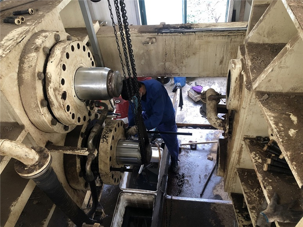 桐鄉(xiāng)申和水務(wù)有限公司非常注重安全生產(chǎn),巡檢人員兢兢業(yè)業(yè),認(rèn)真做好每一次巡查工作。在近日一次日常巡檢中,機(jī)電設(shè)備部人員發(fā)現(xiàn)板框壓濾機(jī)有漏油現(xiàn)象,經(jīng)緊急排查發(fā)現(xiàn)下部活塞處漏油。在聯(lián)系廠家技術(shù)人員確定是活塞處油封問題后,為了確保設(shè)備運(yùn)行正常,機(jī)電部人員立即展開了維修工作。在克服重重困難下,對(duì)板框壓濾機(jī)的活塞油封進(jìn)行了更換,同時(shí)考慮到壓濾機(jī)過于龐大,拆卸困難,便將上部活塞的油封一并進(jìn)行了更換。