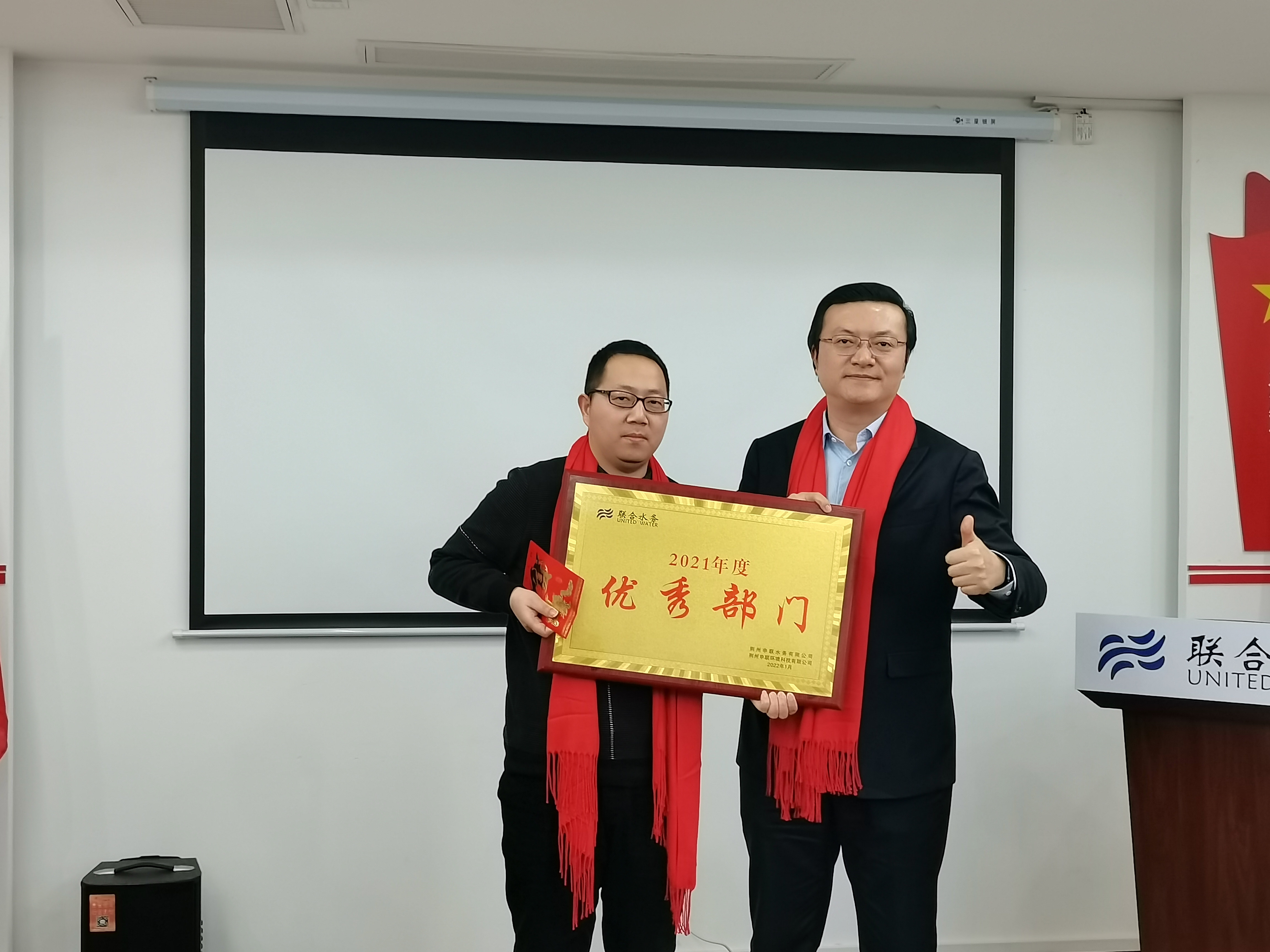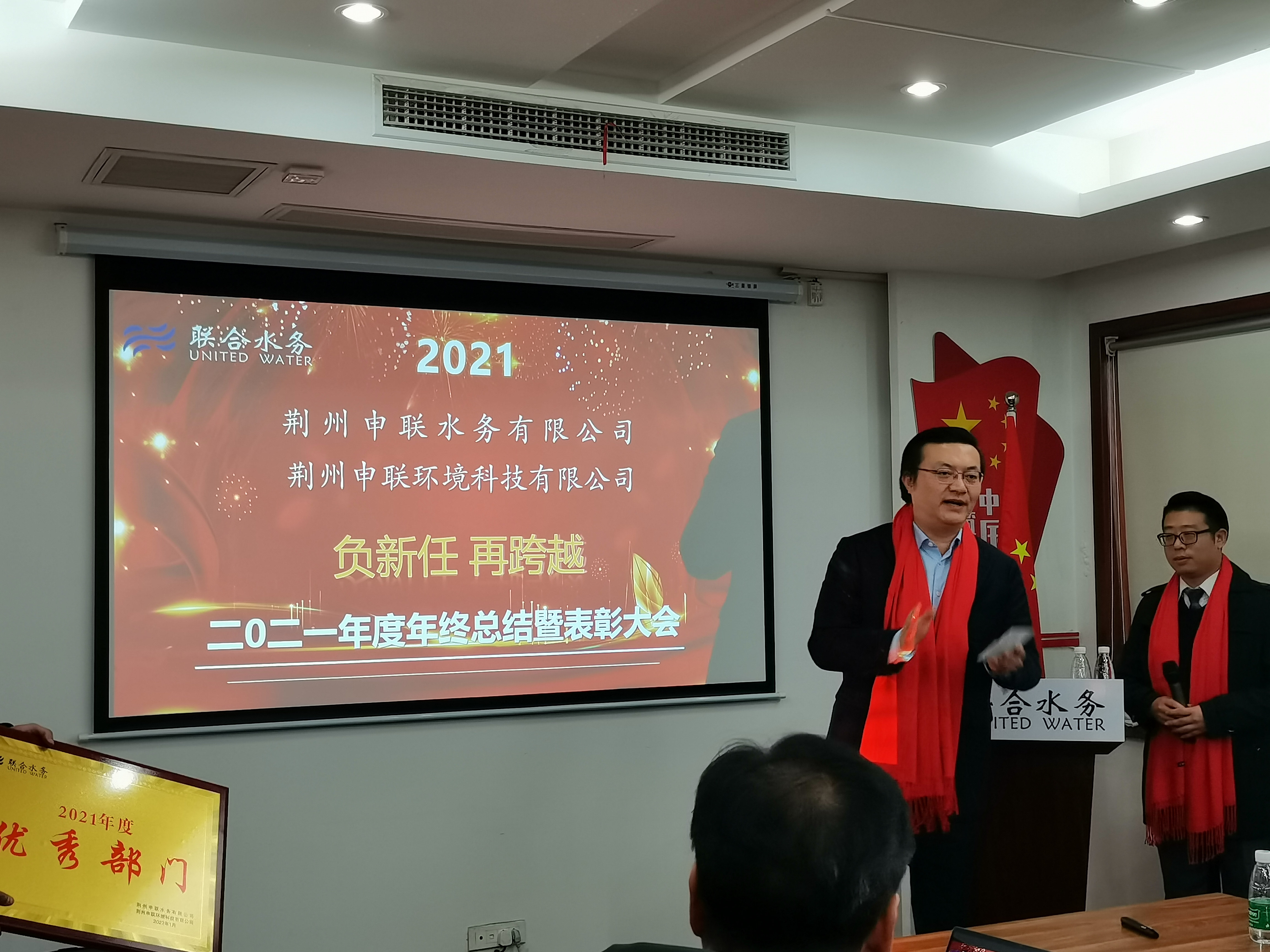 圖:聯(lián)合水務(wù)常務(wù)副總裁劉猛為優(yōu)秀部門頒獎 會議最后,江蘇聯(lián)合水務(wù)科技股份有限公司常務(wù)副總裁劉猛作重要講話。首先,劉總代表總部對荊州公司2021年取得的驕人業(yè)績表示祝賀,對荊州公司全體員工所付出的努力表示衷心的感謝。隨后,劉總用三點(diǎn)感受綜合表述荊州公司取得的成績、面臨的挑戰(zhàn)以及發(fā)展的方向。一是擁抱變化,荊州公司全體員工以更加積極飽滿的熱情擁抱變化,以更加敬業(yè)的精神對待工作,加上管理團(tuán)隊(duì)更加規(guī)范、精細(xì)的管理,才取得了優(yōu)異的成績;二是挑戰(zhàn)自我,雖然面臨設(shè)備老舊、出水達(dá)標(biāo)、業(yè)務(wù)拓展、新的業(yè)績考核指標(biāo)等多重挑戰(zhàn),但荊州公司各部門團(tuán)結(jié)一心,求大同存小異,朝著完成下達(dá)的目標(biāo)不懈努力;三是創(chuàng)造價值,一方面在提標(biāo)升級改造項(xiàng)目竣工前,在產(chǎn)能、工藝雙受限的基礎(chǔ)上,盡量接納更多的污水,為荊州市節(jié)能降碳貢獻(xiàn)力量,為社會創(chuàng)造價值;另一方面,以“我不負(fù)公司,公司定不負(fù)我”的積極心態(tài)繼續(xù)開源節(jié)流,努力打破污水處理廠圍墻邊界所帶來的限制,全方位拓展新業(yè)務(wù),勇于開拓、勇于創(chuàng)新,為公司創(chuàng)造價值。最后,劉總希望大家在虎年虎虎生風(fēng),為荊州公司、為聯(lián)合水務(wù)創(chuàng)造更多的價值、創(chuàng)造更好的業(yè)績。